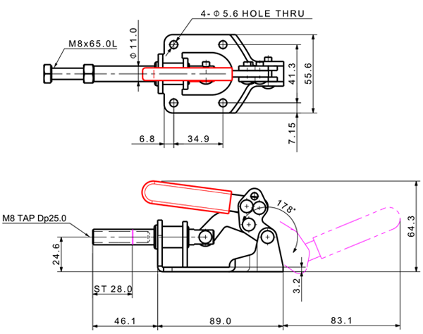 140 306 178˚ M8 x 65.0L 28 Flange