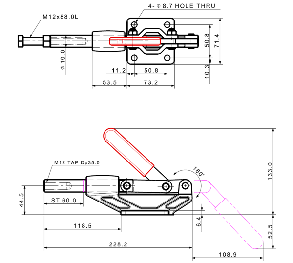 300 830 180˚ M10 x 49.0L 67 Threaded